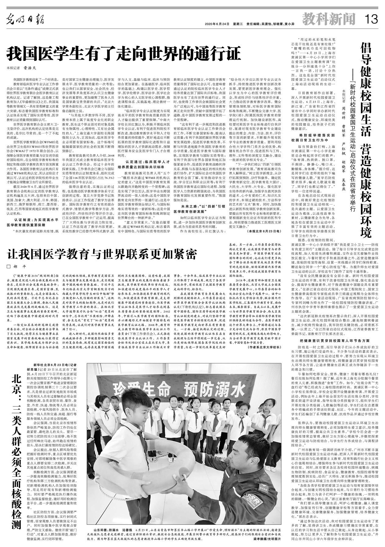 编者按:教育部临床医学专业认证工作委员会日前以“无条件通过”成绩正式获得世界医学教育联合会医学教育认证机构认定,标志着我国医学教育标准和认证体系实现了国际实质等效,医学教育认证质量得到国际认可。北京大学校长、中国高等教育学会副会长郝平在《光明日报》发文,阐释我国医学教育与国际接轨的重大意义。